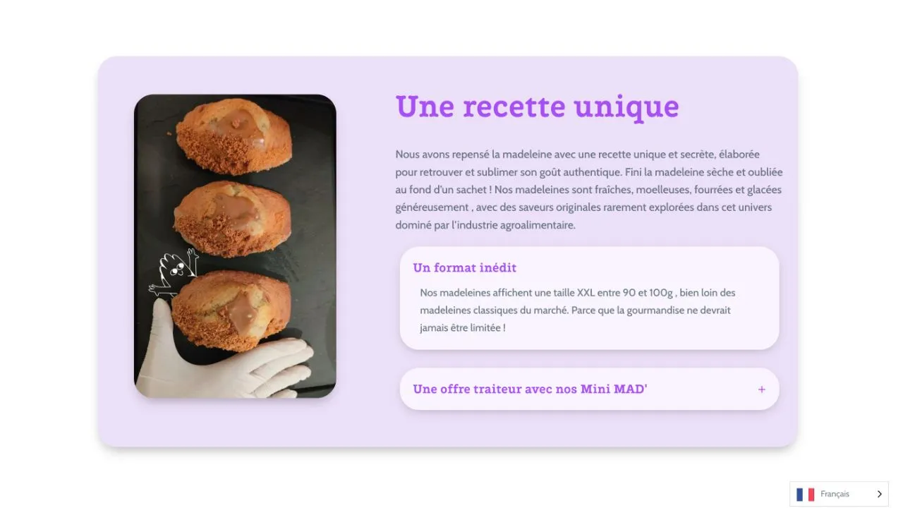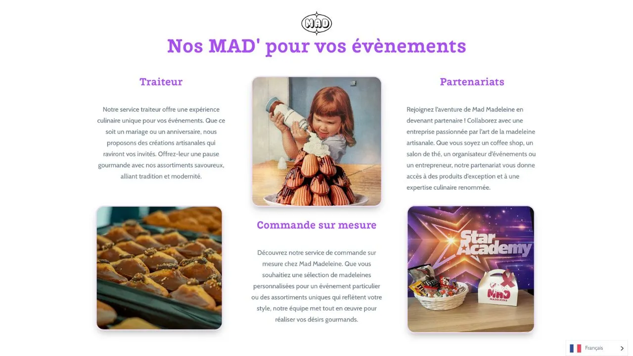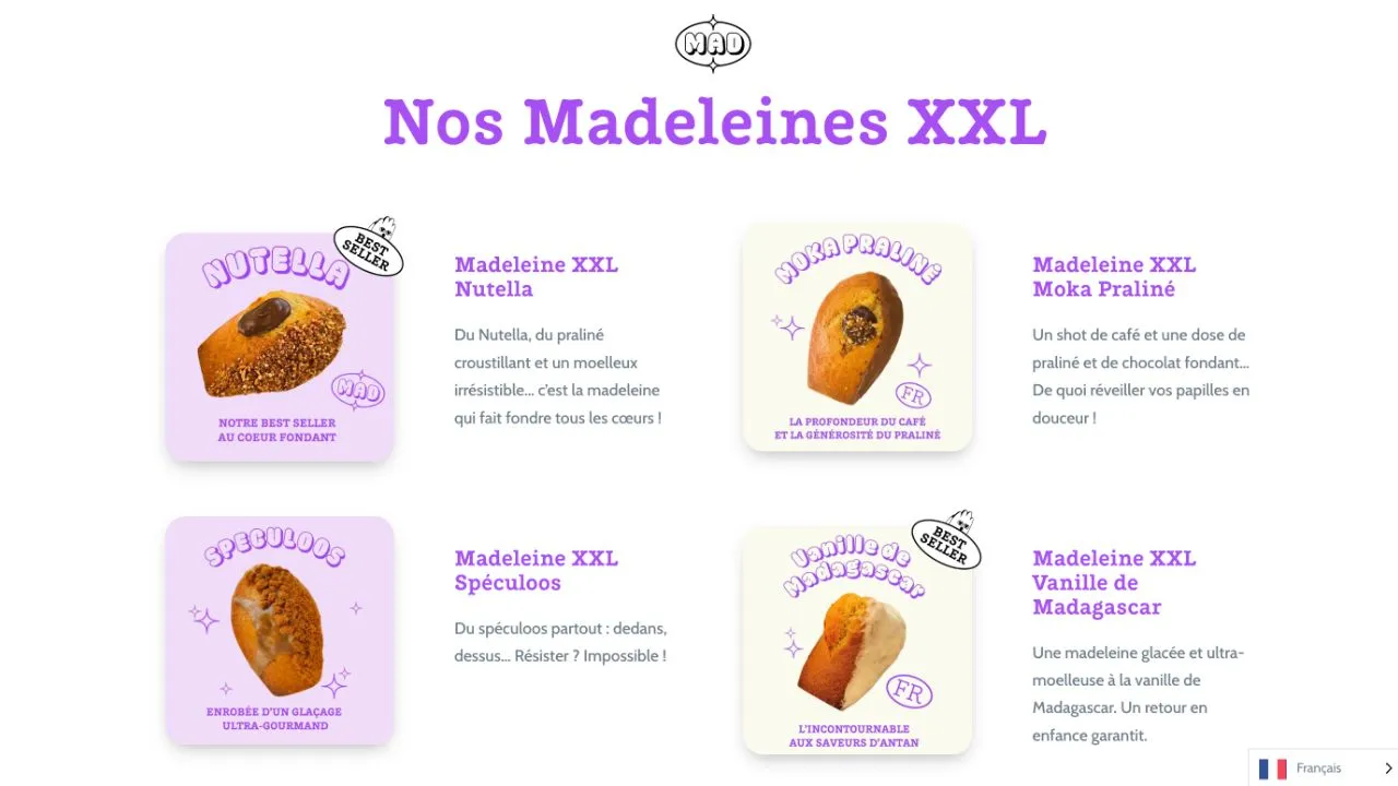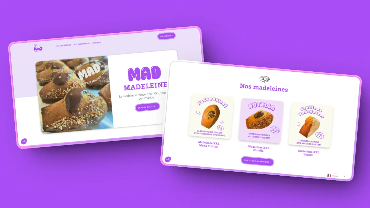 Quand j’ai rejoint le projet Mad Madeleine, le site web avait déjà été amorcé par un précédent prestataire. Mon rôle a été de le repenser intégralement pour lui apporter une structure plus fluide et une esthétique plus percutante. Mon objectif : que chaque visite sur le site donne instantanément l’eau à la bouche. J’ai travaillé sur l’ergonomie, la mise en valeur des visuels et la hiérarchisation des informations pour que l’expérience utilisateur soit à la fois claire et engageante.